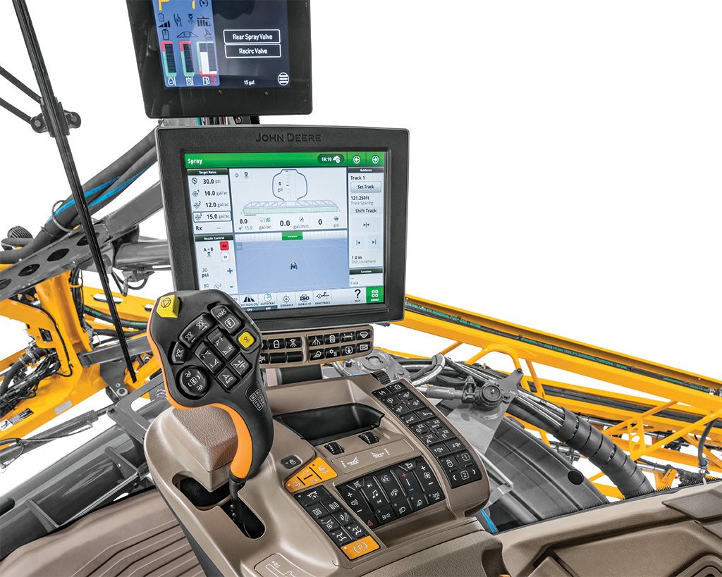 Late season applications utilizing the rear boom over tall crop just got easier and more precise. With up-to-date software, leaving the cab to switch the center section off and divert to the rear boom can now be done from the driver’s seat. Also included is Multi-Rank, the offset of the rear boom is now compensated for.