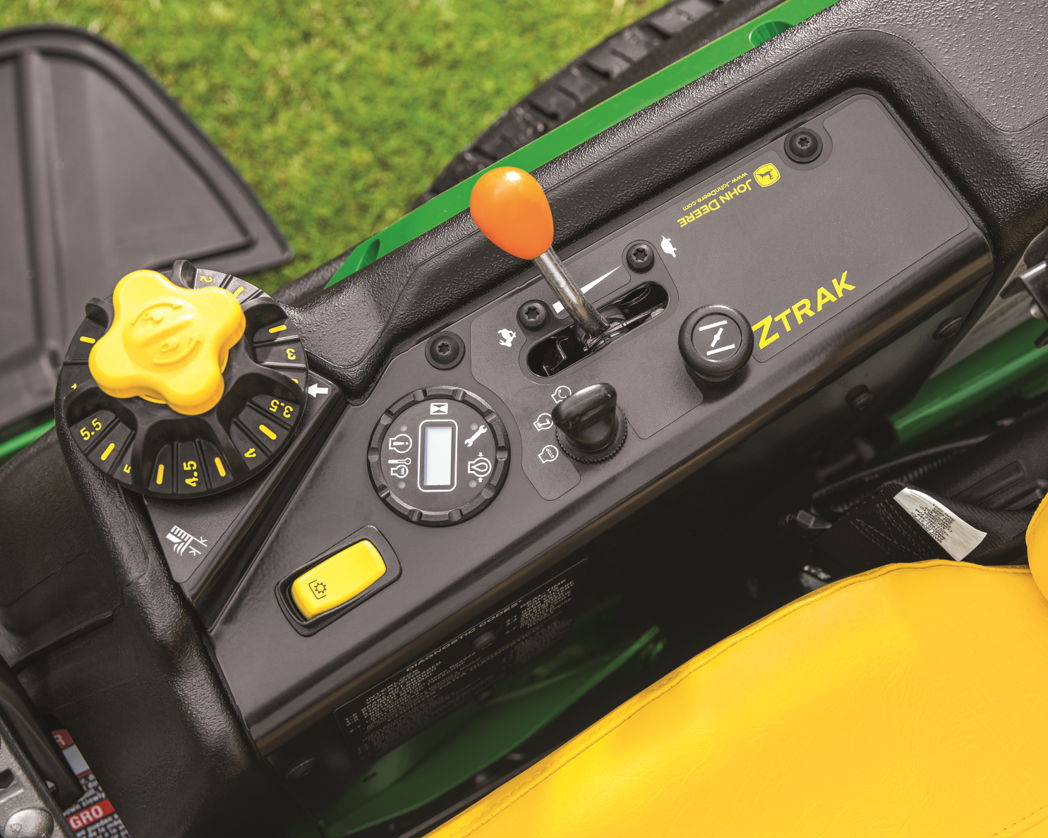The mechanical suspension seat is easier to adjust when off the mower, but it can also be adjusted while the operator is seated. Fore/aft seat adjustment lever is alongside the seat within easy reach and can be used by the operator while seated.